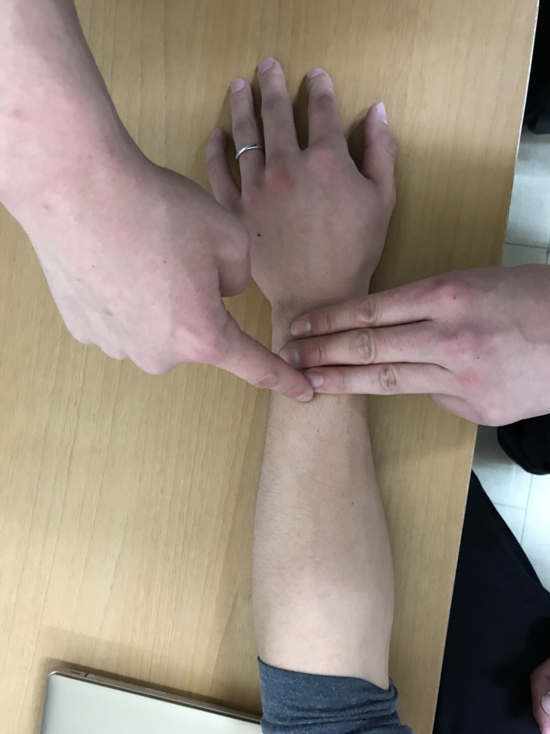 手首のつけ根、小指側で骨と筋の間のくぼみ(皮膚面に対して垂直に強めに押して下さい)