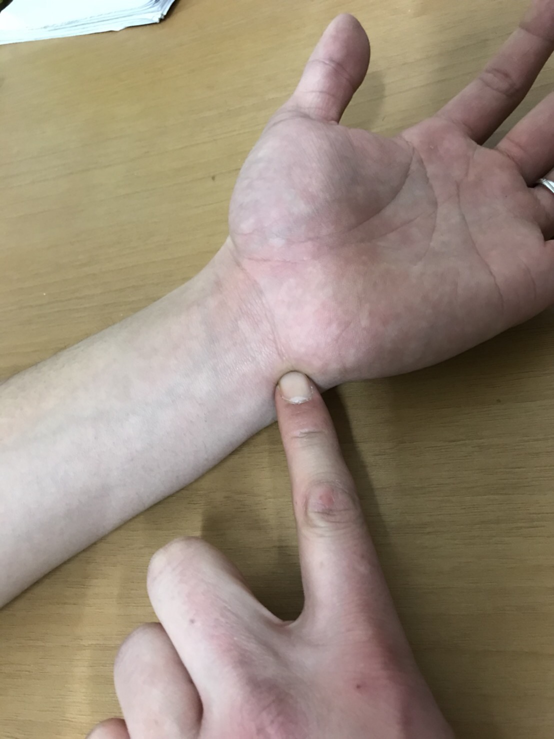 手の甲側で手首から指3本くらいのところの中央部(皮膚面に対して垂直に強めに押して下さい)