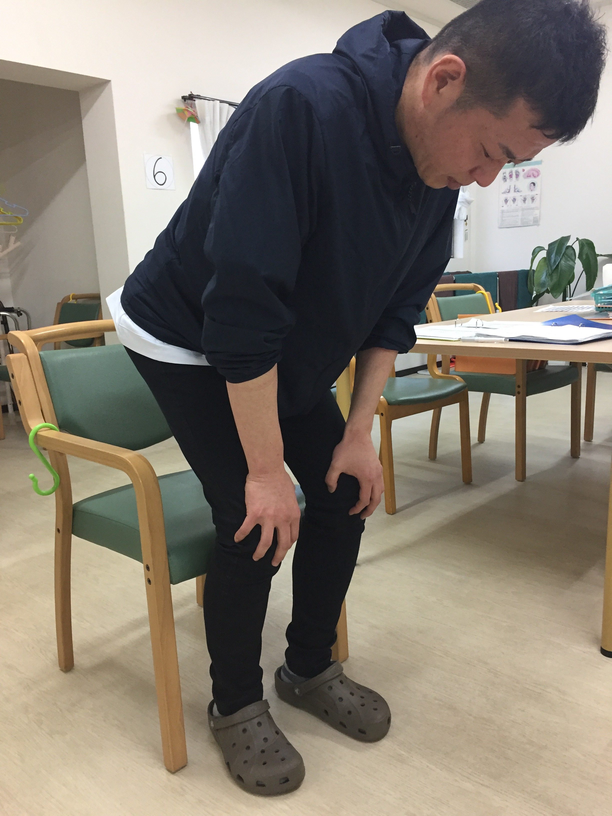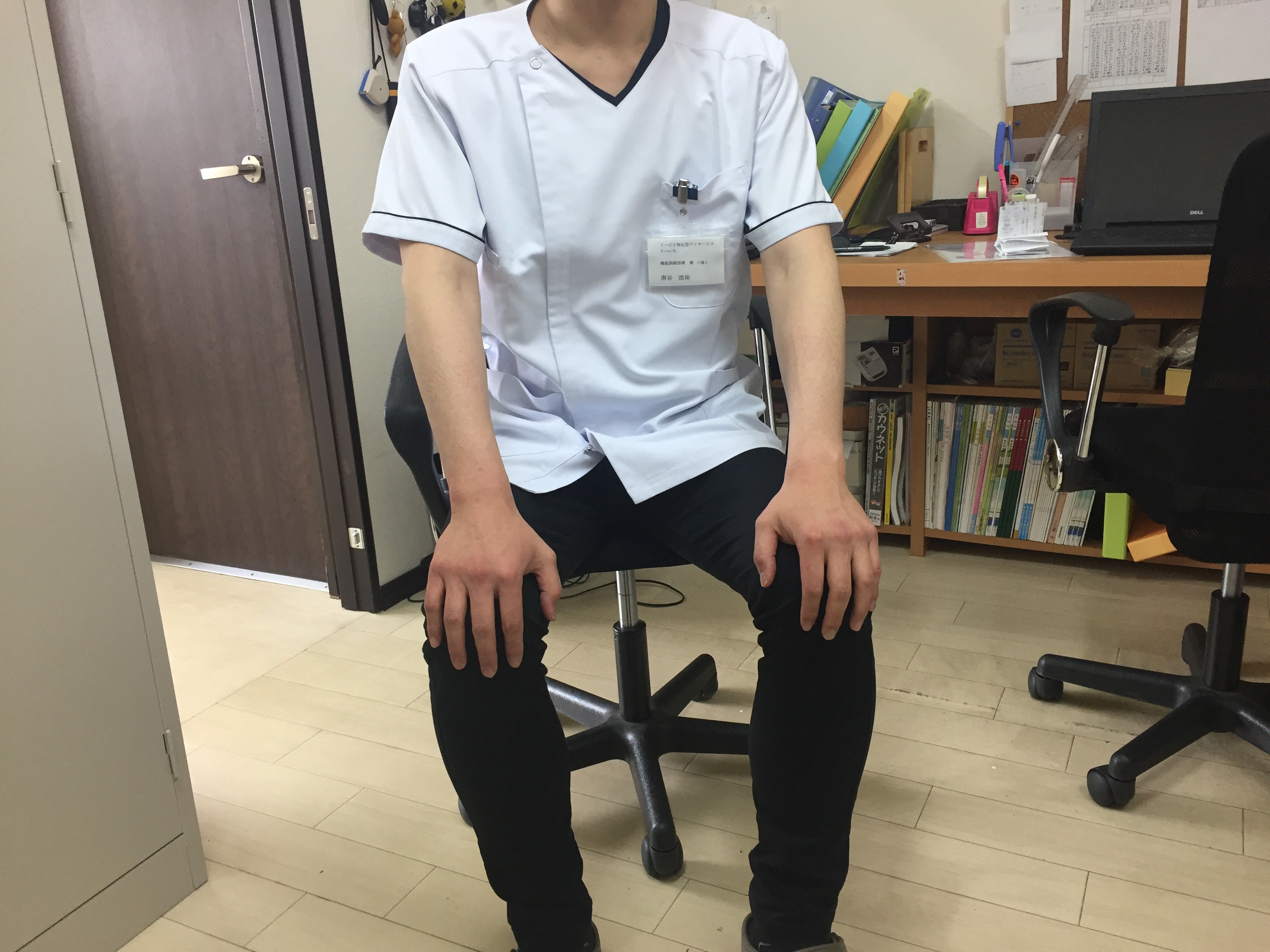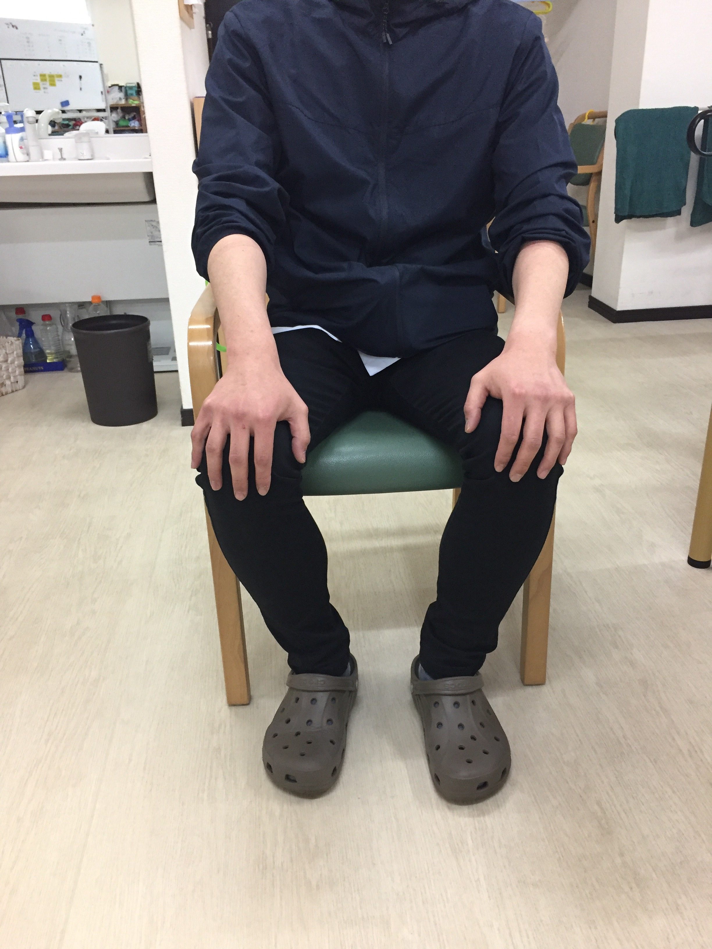まず始めに、椅子に座った状態で、膝をさすります。