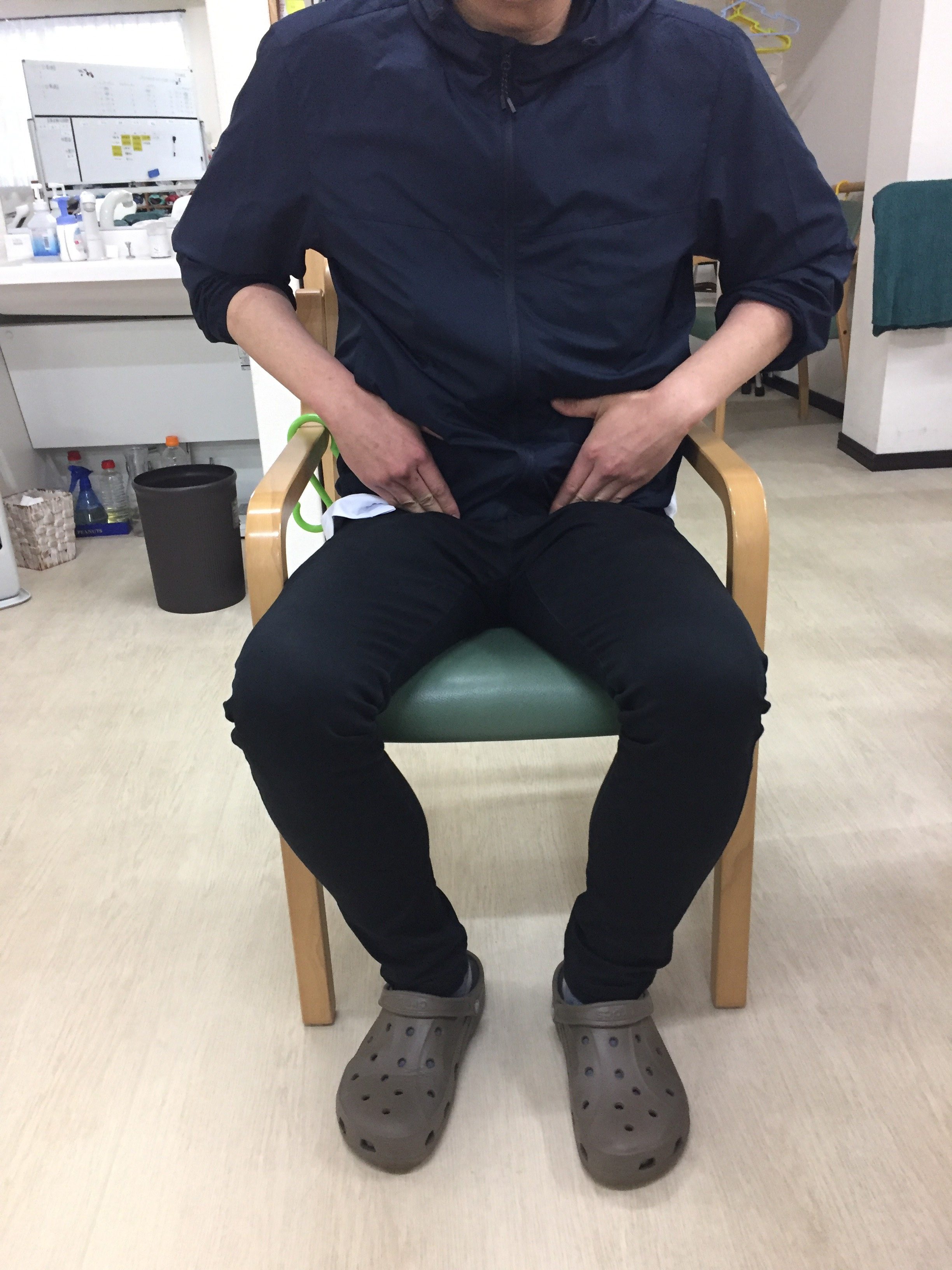 次に、椅子に座った状態で鼠径部(足の付け根)をさすります。