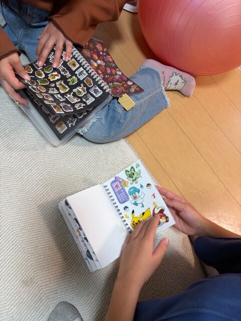 この写真は、私の息子と息子の同級生の女の子がシール交換をしている様子です。
