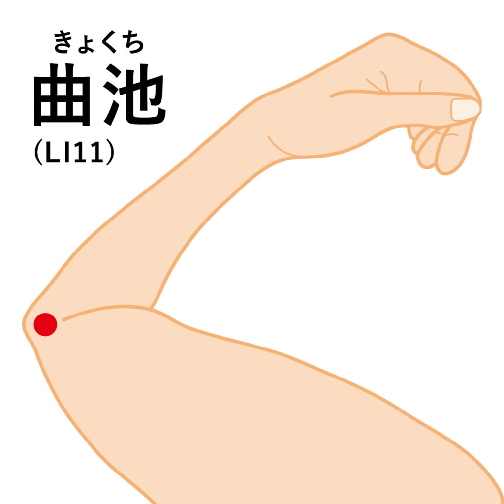 肘を曲げたとき、肘の外側のしわの端にあるツボです。熱を下げ、体のバランスを整える働きがあり、風邪の予防や肌のトラブルにも良いとされています。
