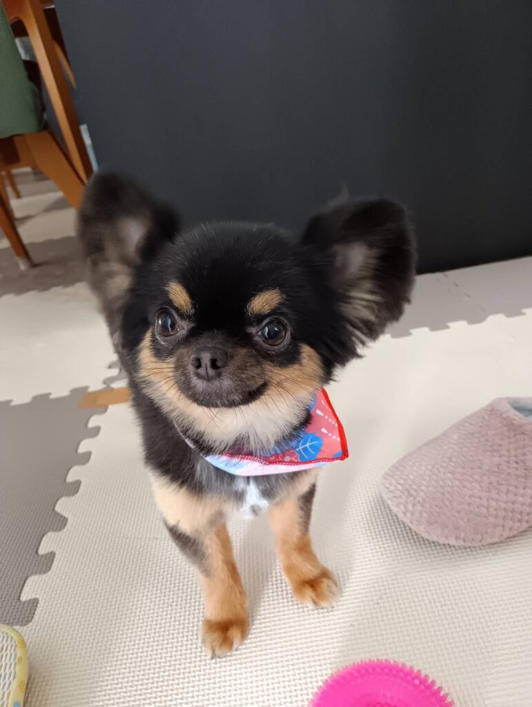 3歳の女の子です。ブラックタンでかわいいです。横になったら体の上に乗ってきます。家に帰ってきたら遊んでとボールを持ってきます。疲れた時は癒されます。